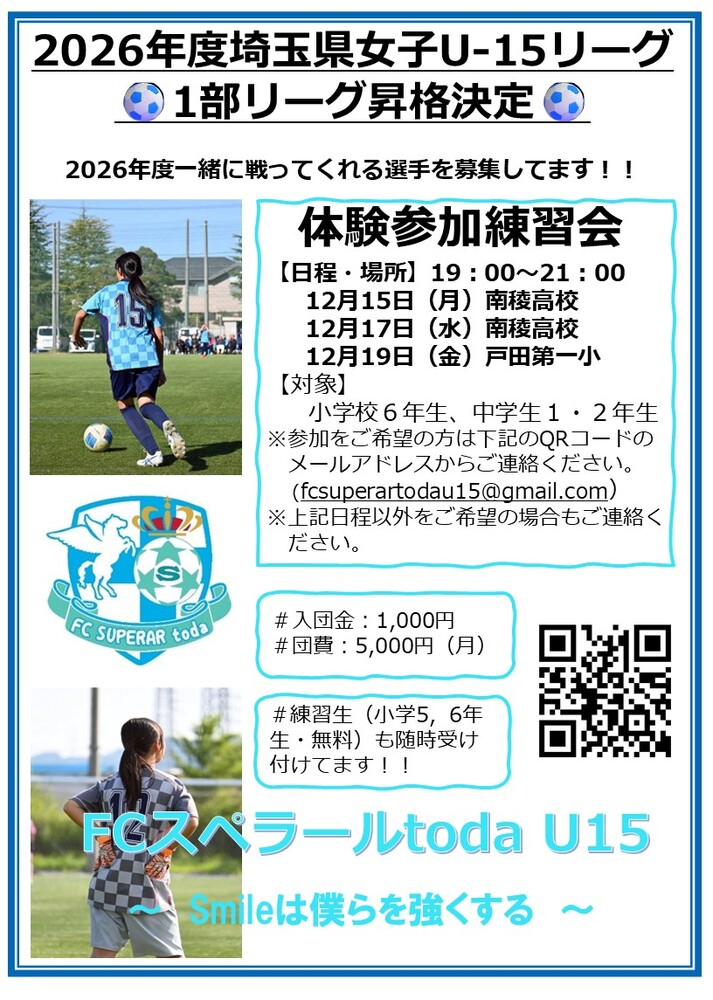 体験練習会の参加をご希望の方は記載のQRコード(fcsuperartodau15@gmail.com)から①希望日、②氏名、③サッカー経験の有無(所属チーム等)等を記載して送信下さい。